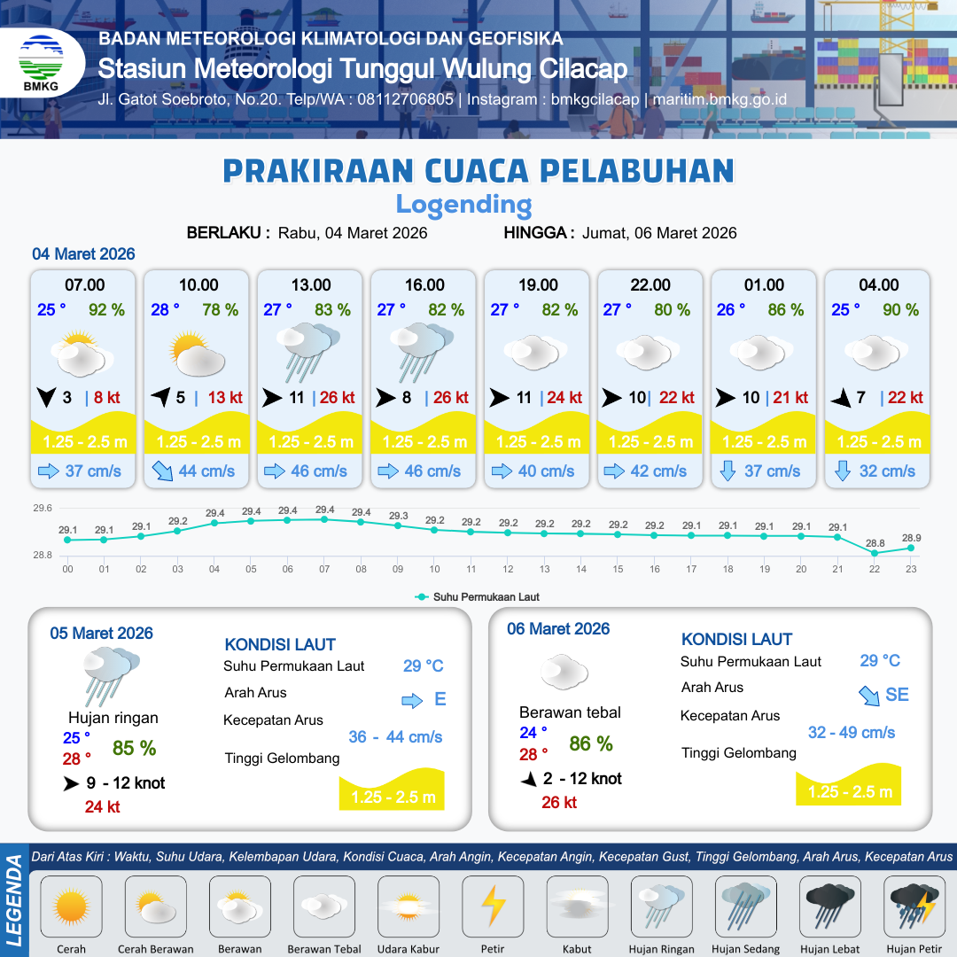 3 Mar 26, 11.00 9 jam yang lalu | Berawan Tebal | Barat Laut 2 kt Gust Peningkatan kecepatan angin yang singkat dan tiba-tiba : 10 kt | | | 10 km | 25 °C | 93 % | +0.47 m |
