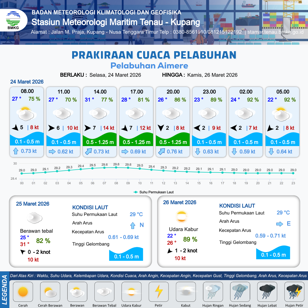 24 Mar 26, 14.00 14 jam kedepan | Timur 2 kt Gust Peningkatan kecepatan angin yang singkat dan tiba-tiba : 8 kt | 0.5 m Rendah | Selatan 0.7 Knot | 8 km | 23 °C | 89 % | -0.77 m | |