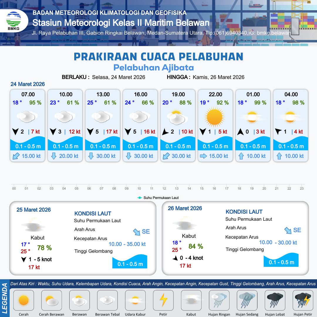 24 Mar 26, 06.00 6 jam kedepan | Utara 5 kt Gust Peningkatan kecepatan angin yang singkat dan tiba-tiba : 17 kt | 0.2 m Tenang | Selatan 30.0 Knot | 10 km | 25 °C | 61 % | +0.10 m | |
