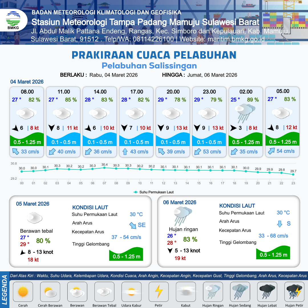 3 Mar 26, 23.00 3 jam kedepan | Berawan Tebal | Utara 10 kt Gust Peningkatan kecepatan angin yang singkat dan tiba-tiba : 12 kt | | | 10 km | 27 °C | 82 % | +0.29 m |
