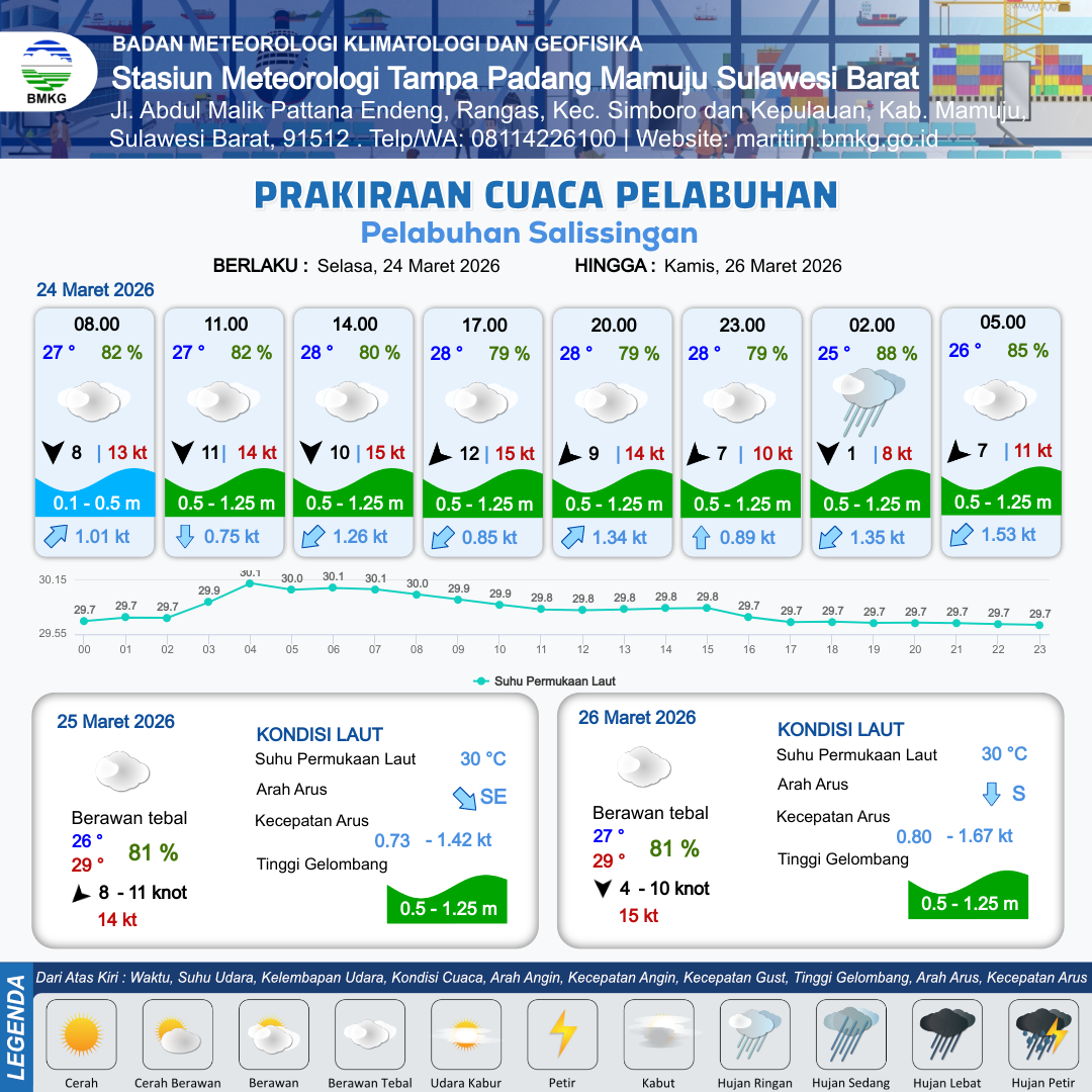 24 Mar 26, 08.00 8 jam kedepan | Utara 13 kt Gust Peningkatan kecepatan angin yang singkat dan tiba-tiba : 17 kt | 0.9 m Rendah | Selatan 1.2 Knot | 10 km | 28 °C | 80 % | -0.01 m | |