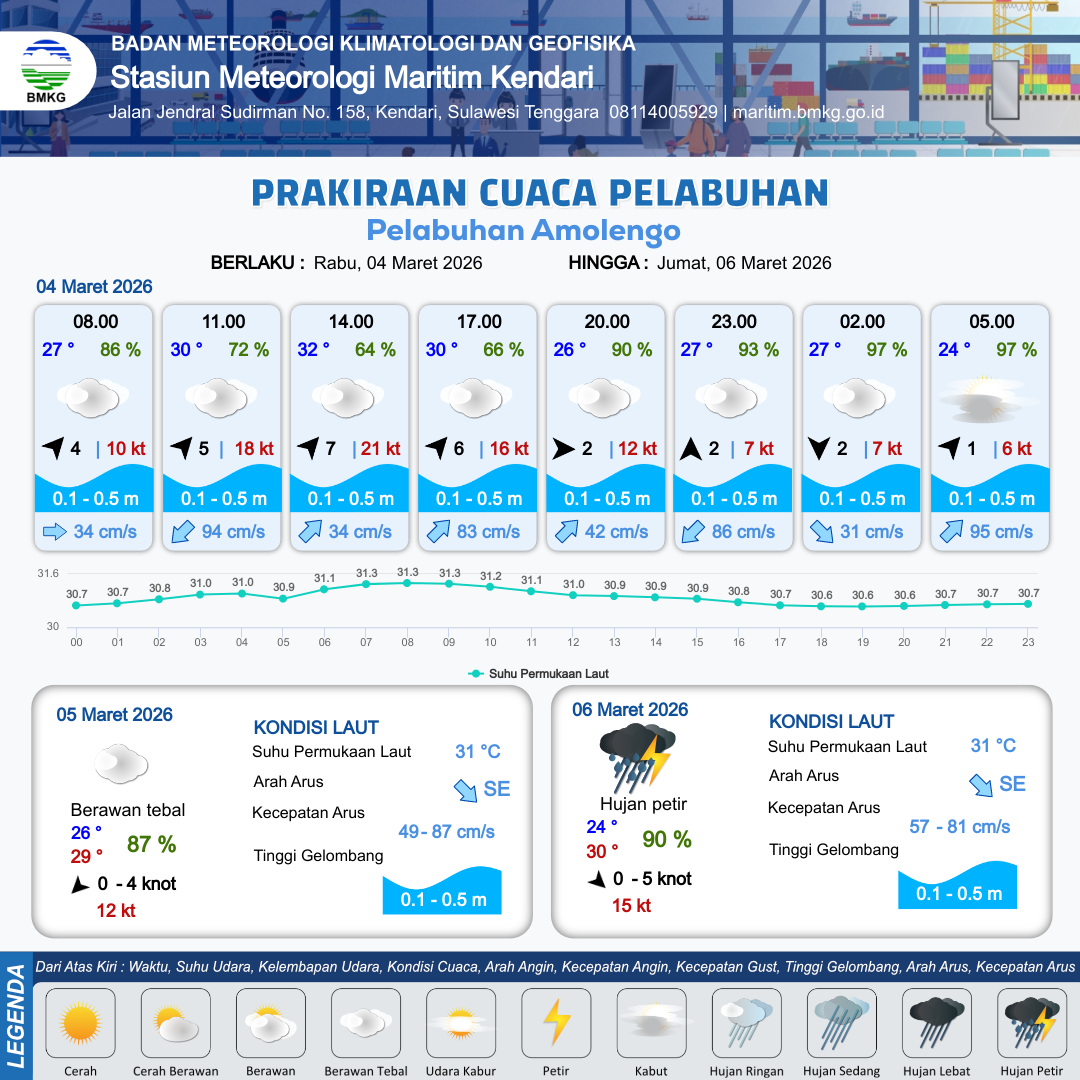 3 Mar 26, 06.00 14 jam yang lalu | Berawan | Barat 6 kt Gust Peningkatan kecepatan angin yang singkat dan tiba-tiba : 24 kt | | | 10 km | 30 °C | 64 % | +1.01 m |