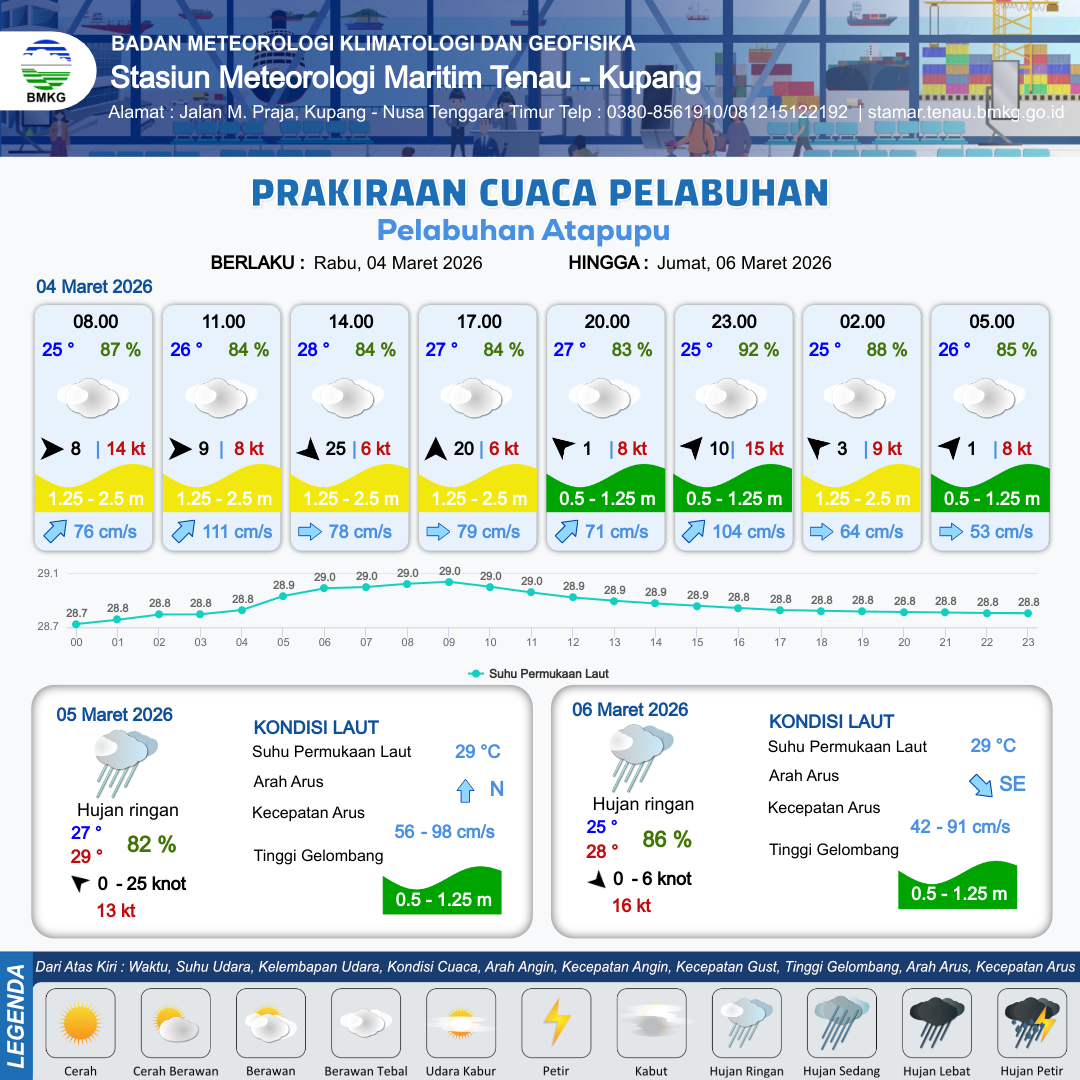 3 Mar 26, 23.00 3 jam kedepan | Berawan Tebal | Barat 10 kt Gust Peningkatan kecepatan angin yang singkat dan tiba-tiba : 7 kt | | | 8 km | 25 °C | 88 % | -0.90 m |
