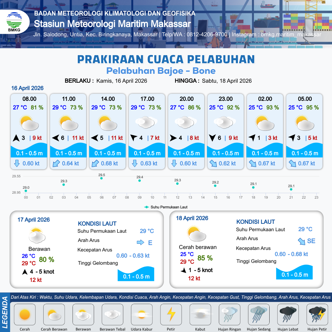 16 Apr 26, 23.00 3 jam kedepan | Cerah Berawan | Selatan 4 kt Gust Peningkatan kecepatan angin yang singkat dan tiba-tiba : 6 kt | | | 7 km | 26 °C | 93 % | +0.61 m |