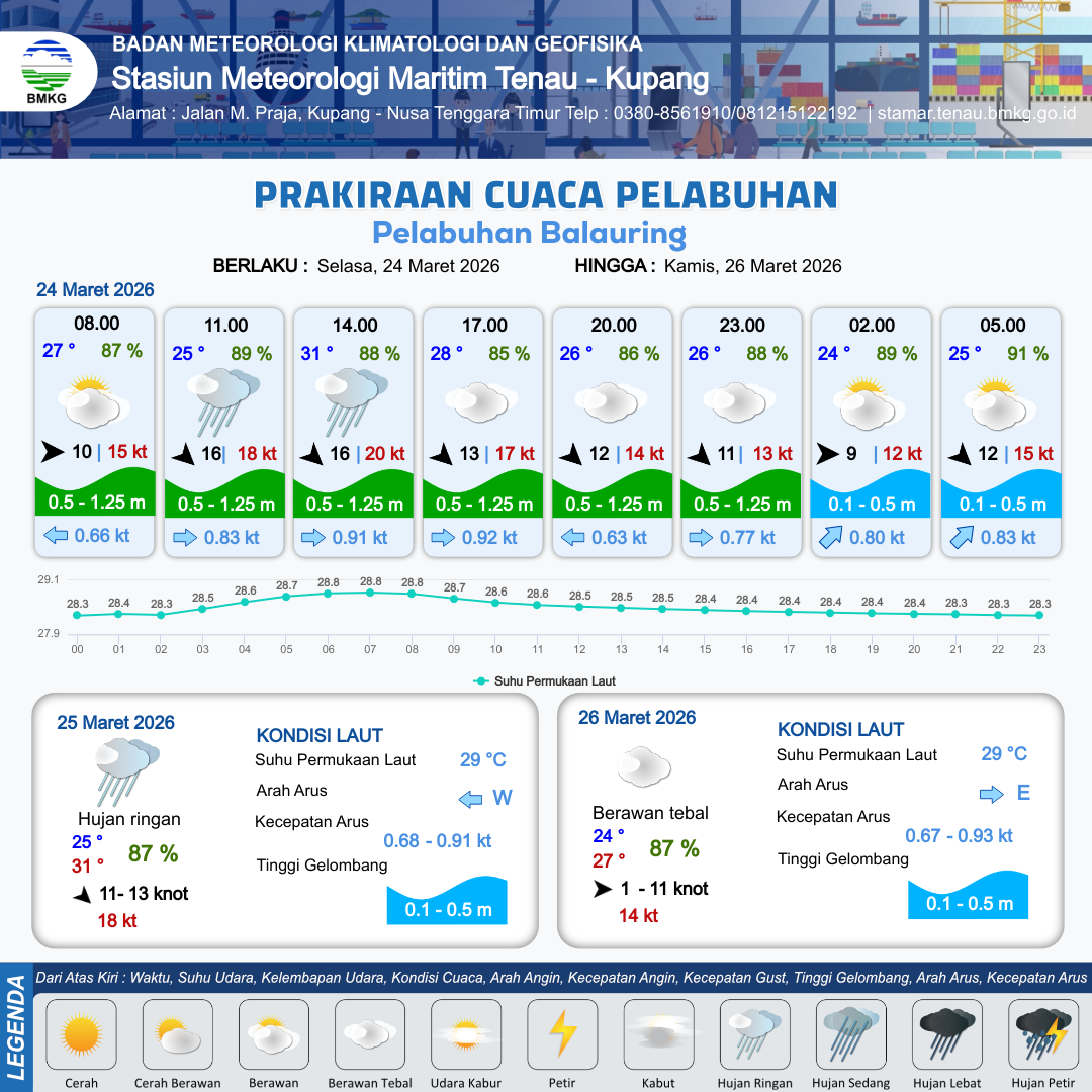 24 Mar 26, 05.00 5 jam kedepan | Barat Laut 16 kt Gust Peningkatan kecepatan angin yang singkat dan tiba-tiba : 20 kt | 0.6 m Rendah | Timur 0.9 Knot | 8 km | 29 °C | 90 % | +0.03 m | |