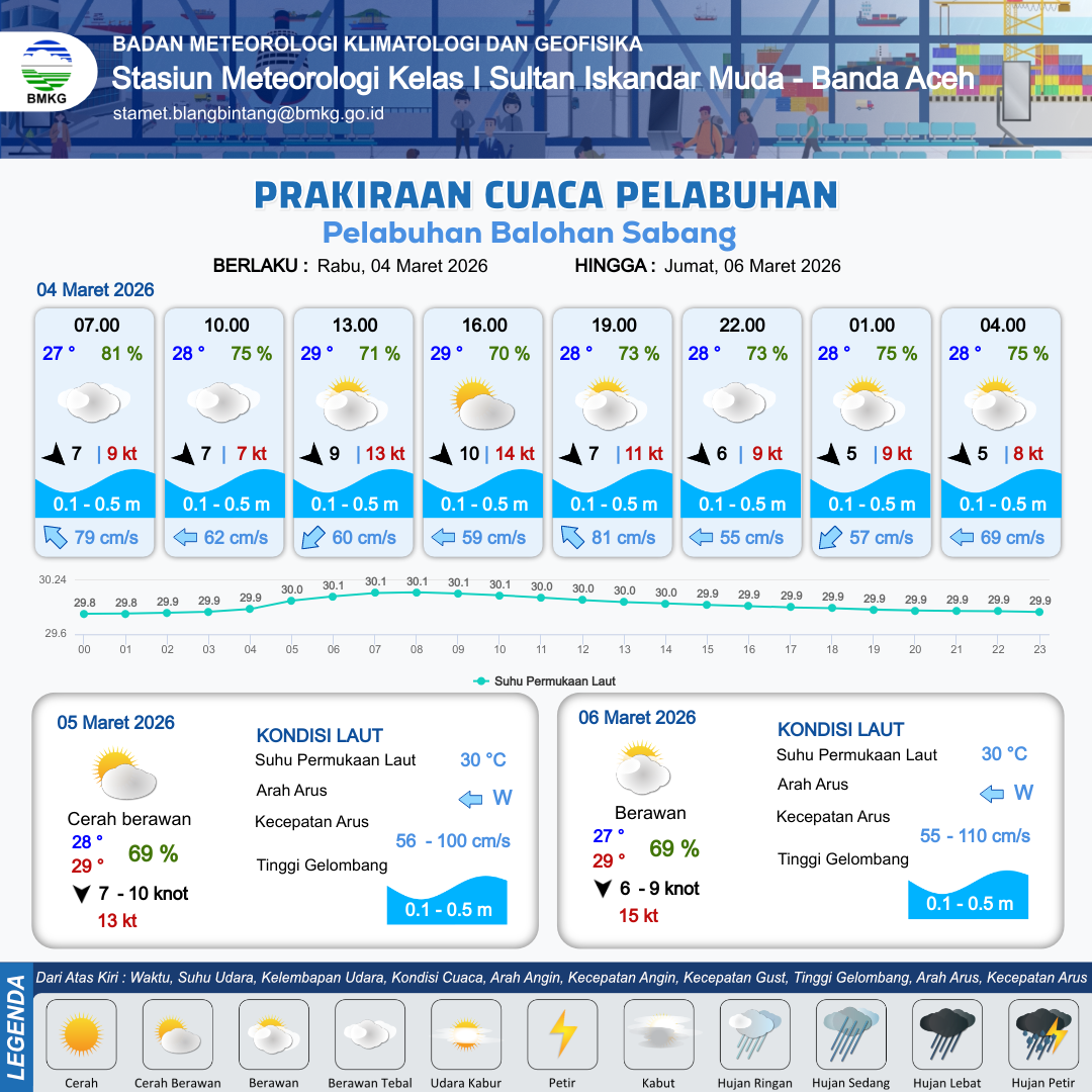 3 Mar 26, 08.00 12 jam yang lalu | Berawan Tebal | Barat Laut 9 kt Gust Peningkatan kecepatan angin yang singkat dan tiba-tiba : 10 kt | | | 10 km | 29 °C | 73 % | -0.53 m |