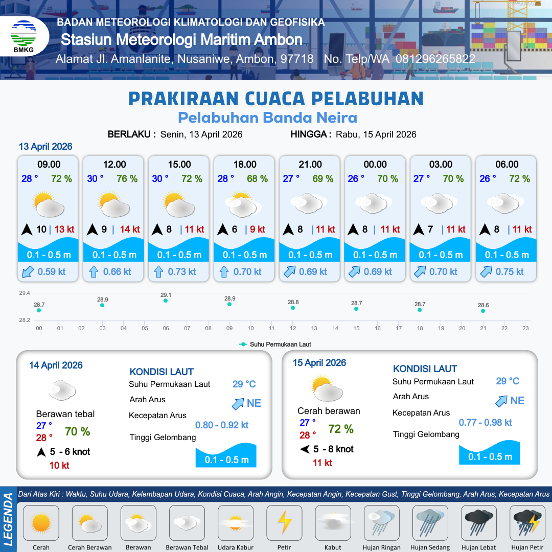 13 Apr 26, 13.00 5 jam yang lalu | Berawan Tebal | Selatan 8 kt Gust Peningkatan kecepatan angin yang singkat dan tiba-tiba : 12 kt | | | 10 km | 27 °C | 70 % | +0.66 m |