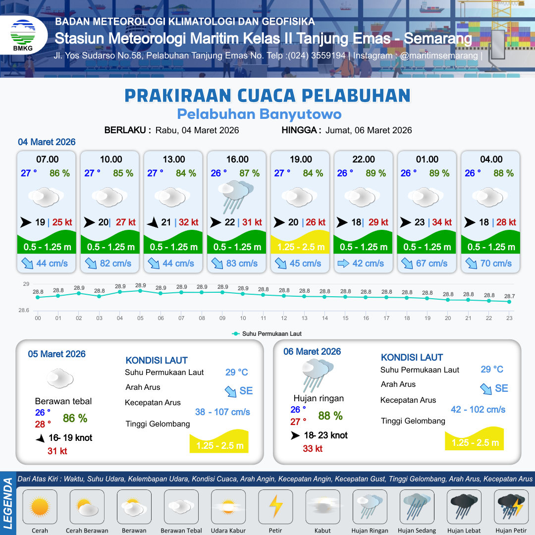 3 Mar 26, 23.00 3 jam kedepan | Berawan Tebal | Barat 18 kt Gust Peningkatan kecepatan angin yang singkat dan tiba-tiba : 29 kt | | | 8 km | 27 °C | 87 % | -0.25 m |