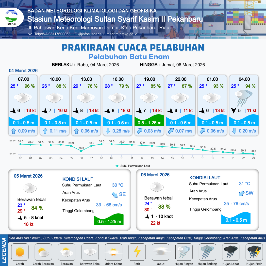 3 Mar 26, 22.00 2 jam kedepan | Berawan Tebal | Utara 6 kt Gust Peningkatan kecepatan angin yang singkat dan tiba-tiba : 12 kt | | | 7 km | 24 °C | 96 % | +2.69 m |