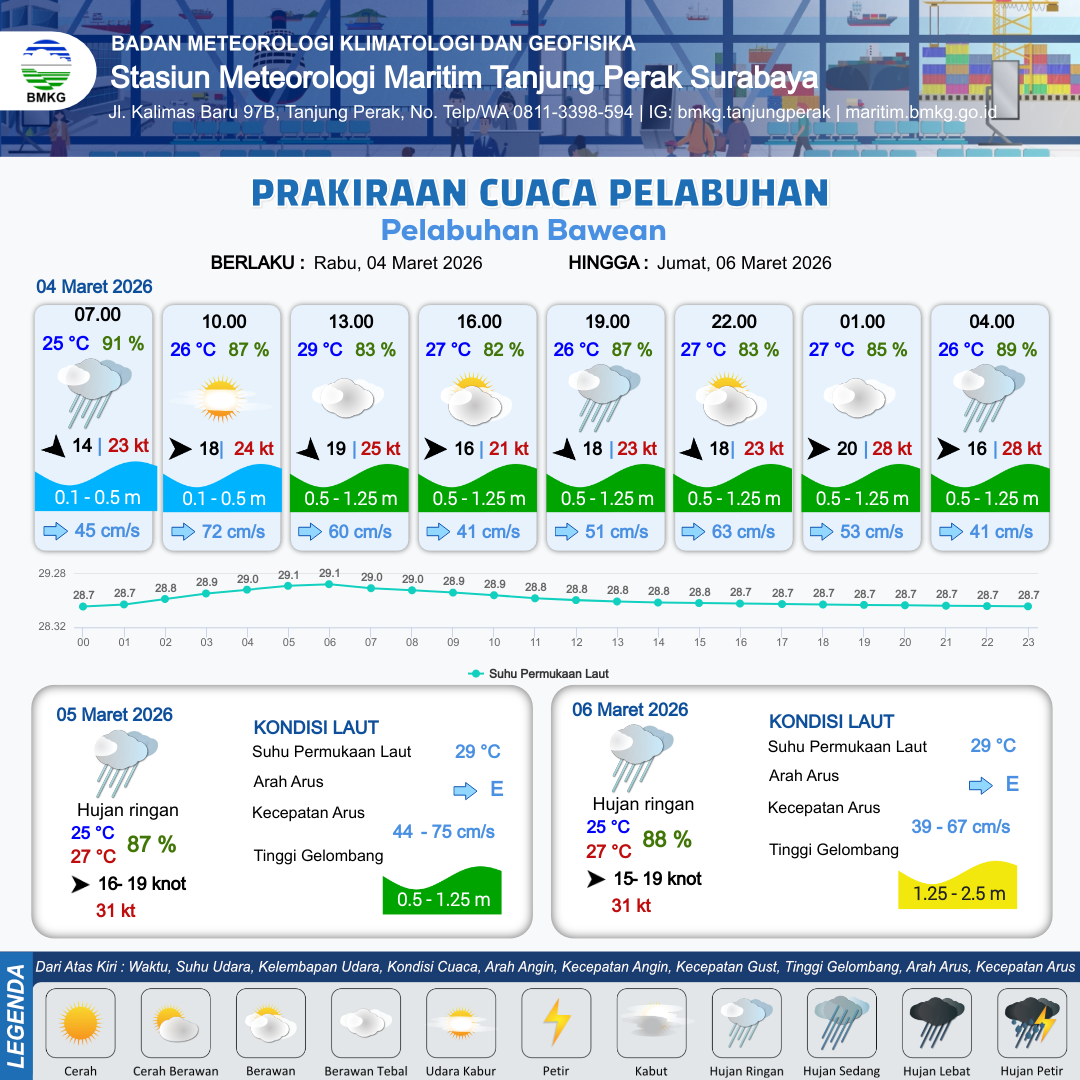 3 Mar 26, 10.00 10 jam yang lalu | Berawan Tebal | Barat 12 kt Gust Peningkatan kecepatan angin yang singkat dan tiba-tiba : 17 kt | | | 10 km | 27 °C | 82 % | +0.69 m |