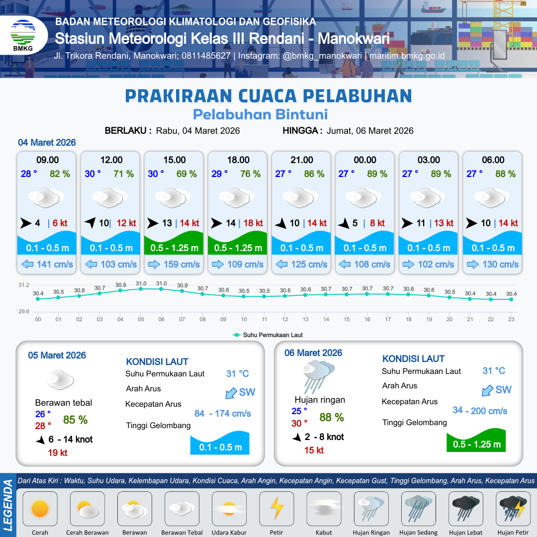 3 Mar 26, 04.00 16 jam yang lalu | Berawan Tebal | Barat Daya 5 kt Gust Peningkatan kecepatan angin yang singkat dan tiba-tiba : 10 kt | | | 8 km | 30 °C | 73 % | -3.63 m |