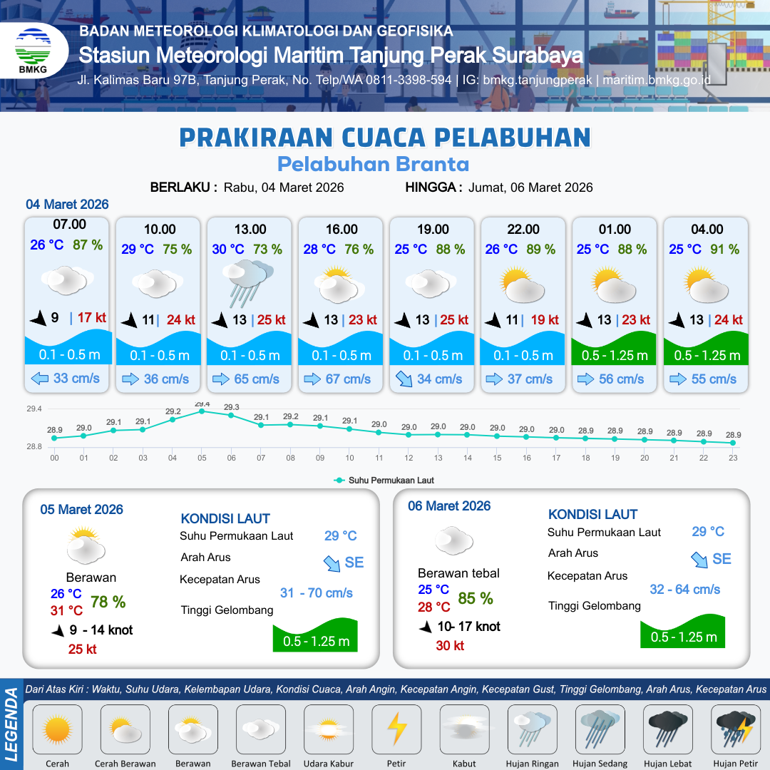 3 Mar 26, 05.00 15 jam yang lalu | Berawan Tebal | Barat 20 kt Gust Peningkatan kecepatan angin yang singkat dan tiba-tiba : 18 kt | | | 10 km | 30 °C | 69 % | +1.00 m |