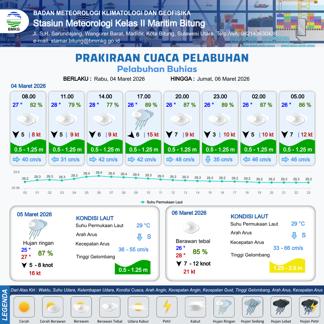 3 Mar 26, 22.00 2 jam kedepan | Hujan Ringan | Utara 6 kt Gust Peningkatan kecepatan angin yang singkat dan tiba-tiba : 9 kt | | | 9 km | 27 °C | 84 % | +0.53 m |