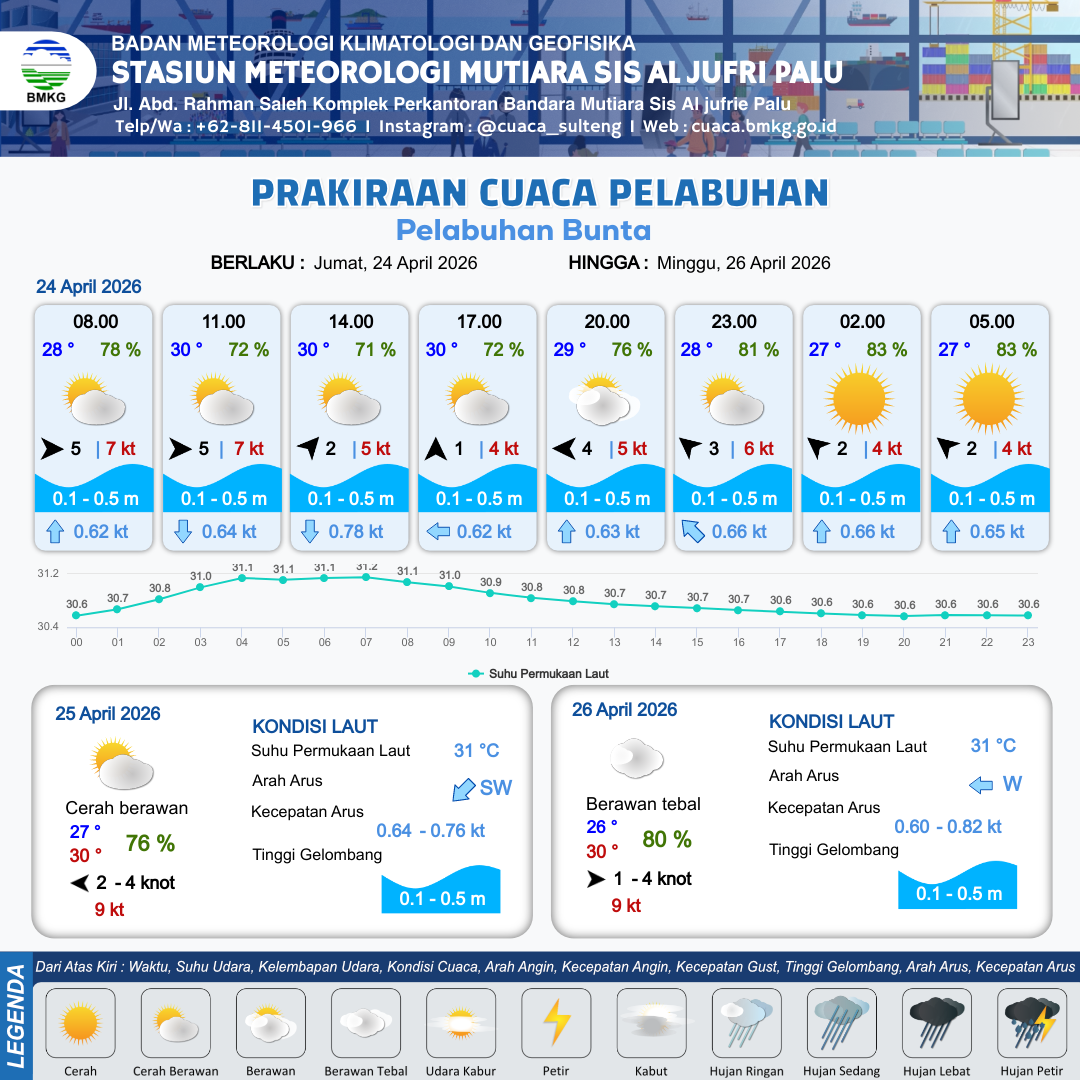 23 Apr 26, 05.00 15 jam kedepan | Utara 4 kt Gust Peningkatan kecepatan angin yang singkat dan tiba-tiba : 5 kt | 0.1 m Tenang | Selatan 0.7 Knot | 10 km | 32 °C | 71 % | -0.14 m | |