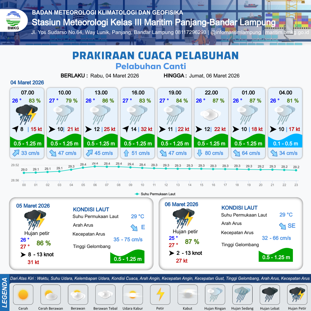 3 Mar 26, 22.00 2 jam kedepan | Berawan Tebal | Barat 12 kt Gust Peningkatan kecepatan angin yang singkat dan tiba-tiba : 18 kt | | | 10 km | 26 °C | 88 % | +0.20 m |