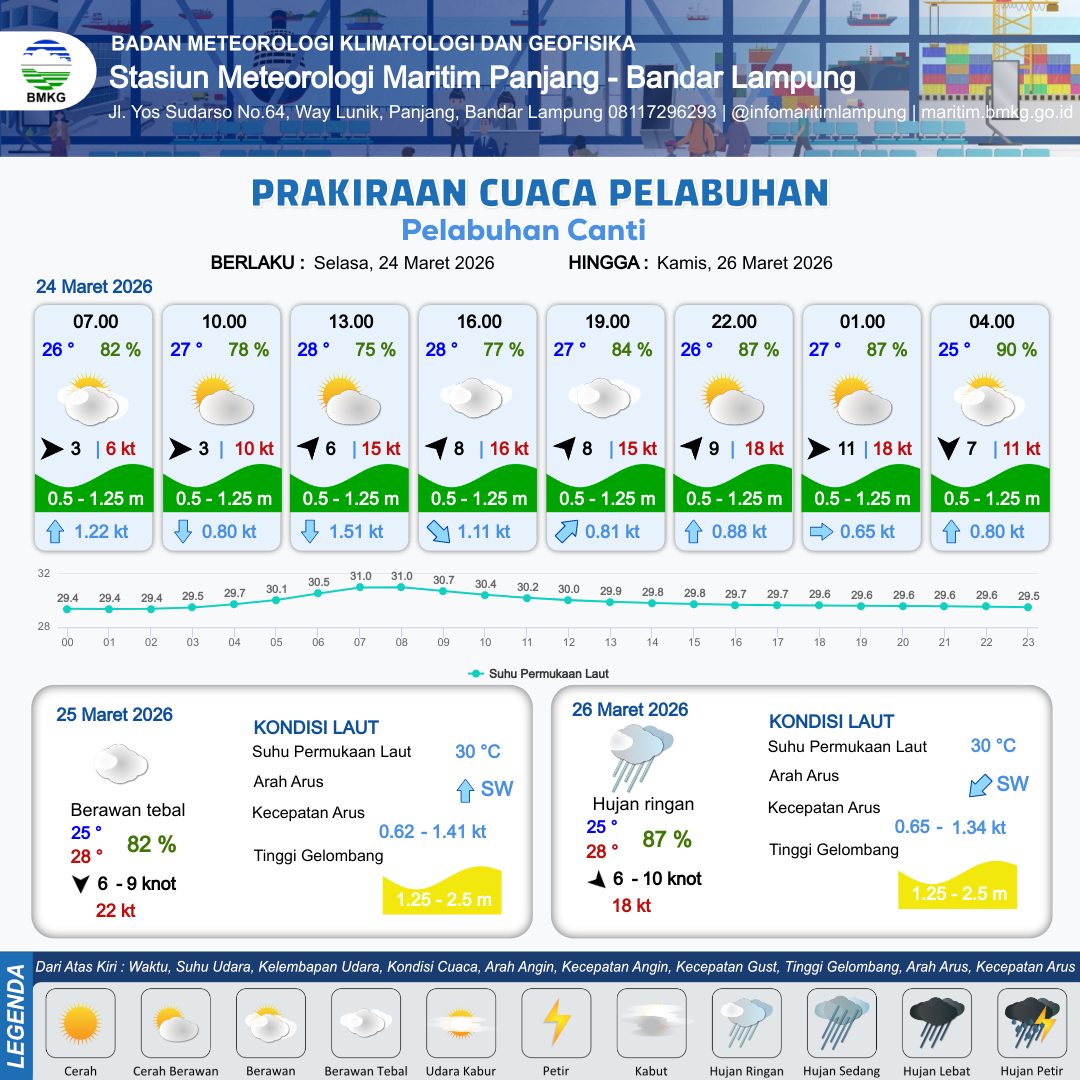 24 Mar 26, 14.00 14 jam kedepan | Barat Daya 9 kt Gust Peningkatan kecepatan angin yang singkat dan tiba-tiba : 17 kt | 0.5 m Rendah | Tenggara 0.8 Knot | 10 km | 26 °C | 86 % | +0.18 m | |