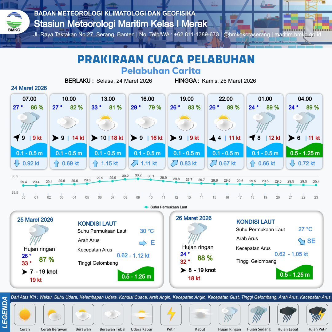 24 Mar 26, 02.00 2 jam kedepan | Barat 9 kt Gust Peningkatan kecepatan angin yang singkat dan tiba-tiba : 12 kt | 0.2 m Tenang | Barat Daya 0.7 Knot | 10 km | 27 °C | 84 % | +0.43 m | |