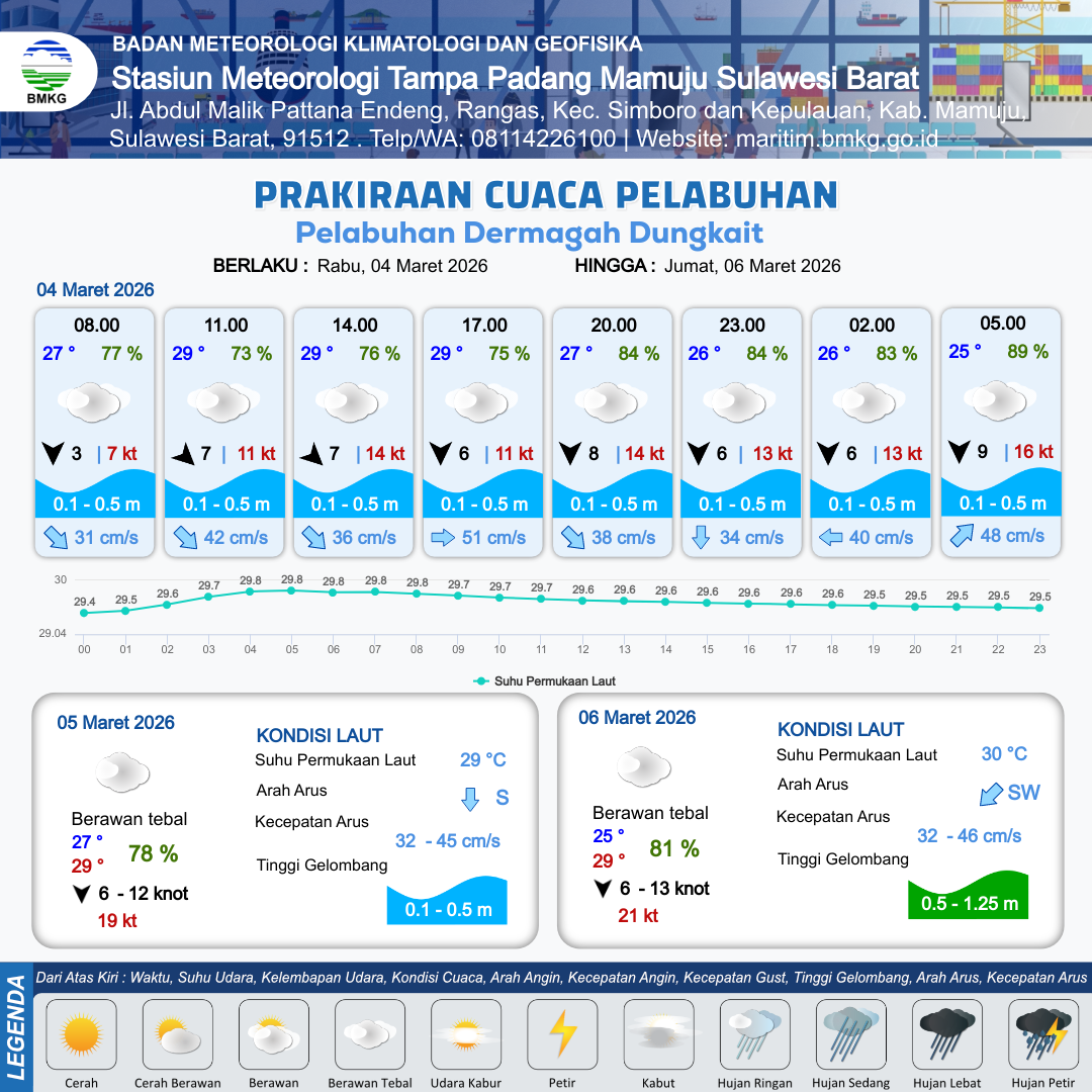 3 Mar 26, 08.00 12 jam yang lalu | Berawan | Barat Laut 7 kt Gust Peningkatan kecepatan angin yang singkat dan tiba-tiba : 12 kt | | | 9 km | 29 °C | 75 % | +0.36 m |