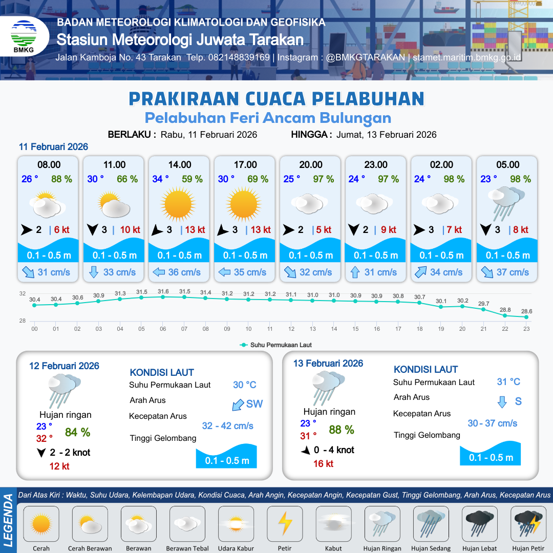 11 Feb 26, 20.00 4 jam kedepan | Utara 3 kt Gust Peningkatan kecepatan angin yang singkat dan tiba-tiba : 8 kt | 0.1 m Tenang | Timur 32.0 cm/s | 10 km | 23 °C | 98 % | -0.03 m | |