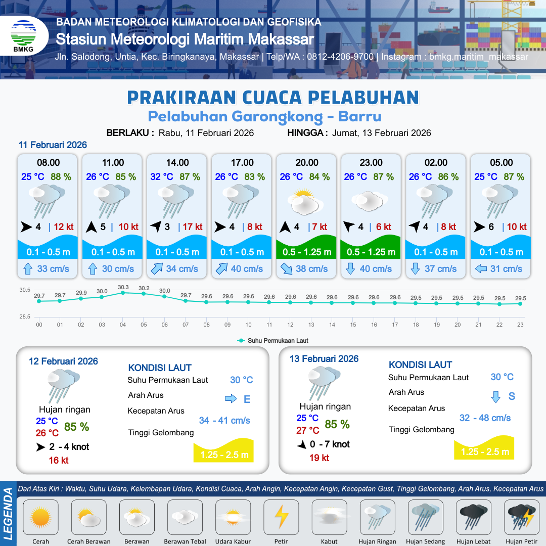 11 Feb 26, 22.00 6 jam kedepan | Barat 6 kt Gust Peningkatan kecepatan angin yang singkat dan tiba-tiba : 9 kt | 0.8 m Rendah | Timur Laut 33.0 cm/s | 8 km | 26 °C | 86 % | -0.13 m | |