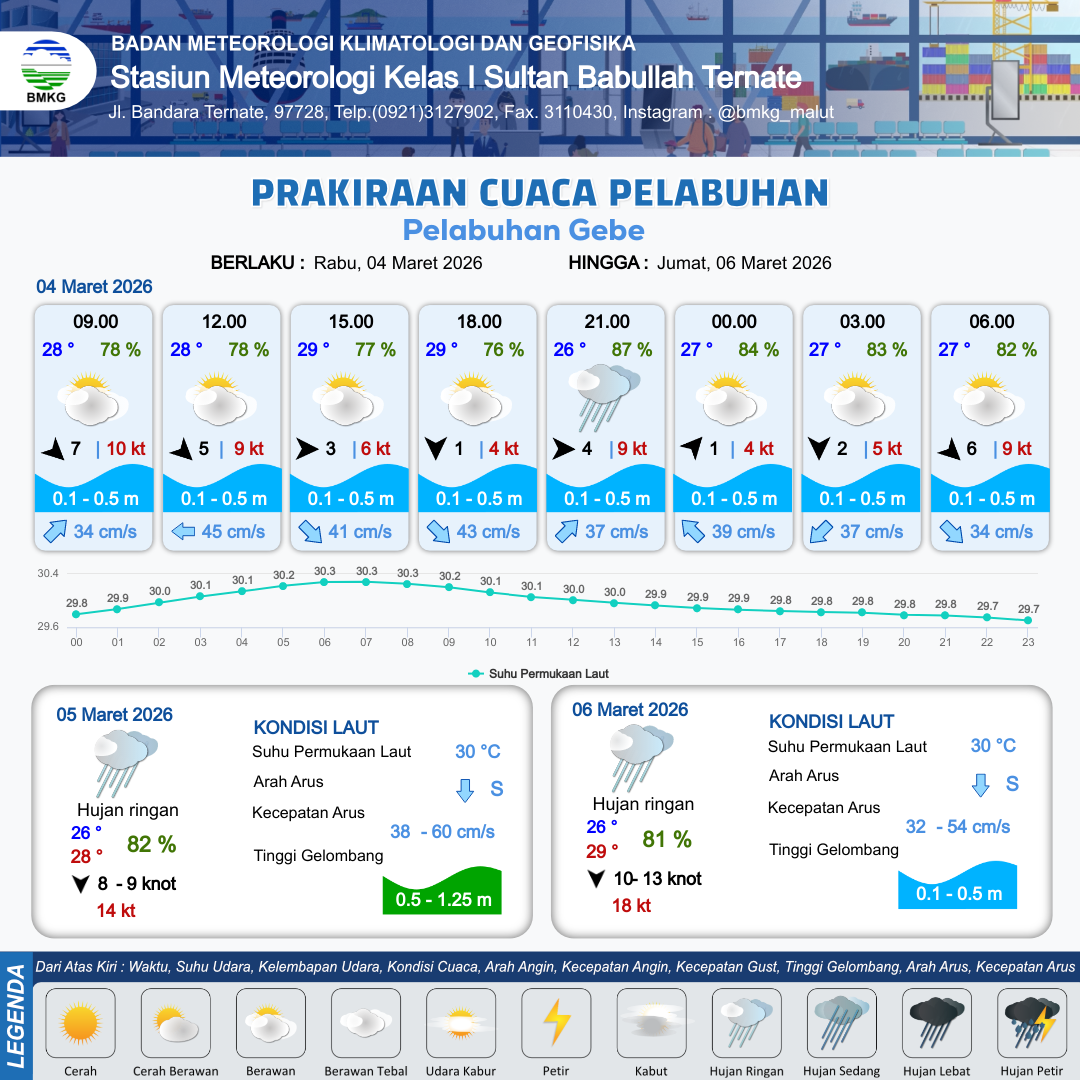 3 Mar 26, 06.00 14 jam yang lalu | Berawan | Barat 5 kt Gust Peningkatan kecepatan angin yang singkat dan tiba-tiba : 11 kt | | | 10 km | 29 °C | 75 % | +0.22 m |