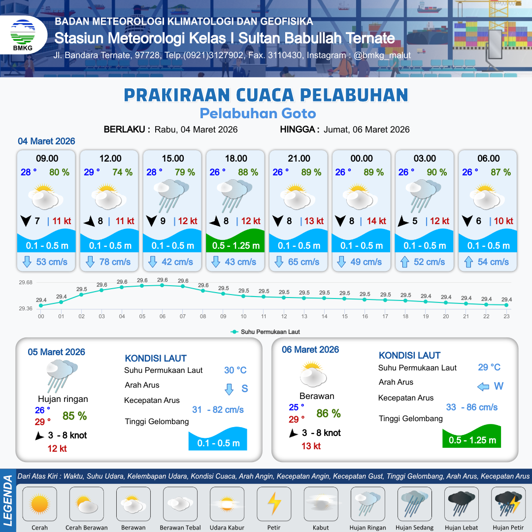3 Mar 26, 05.00 15 jam yang lalu | Berawan | Barat Laut 10 kt Gust Peningkatan kecepatan angin yang singkat dan tiba-tiba : 12 kt | | | 10 km | 29 °C | 72 % | -0.09 m |
