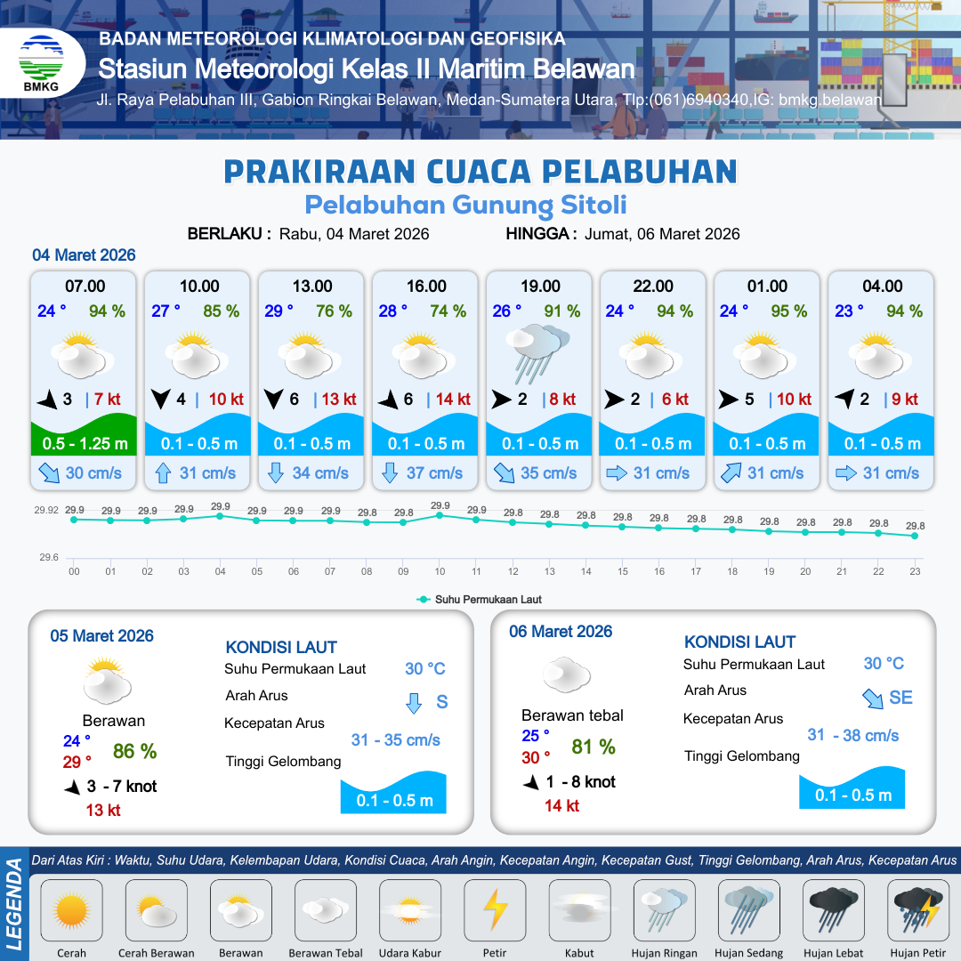 3 Mar 26, 06.00 14 jam yang lalu | Cerah Berawan | Timur Laut 3 kt Gust Peningkatan kecepatan angin yang singkat dan tiba-tiba : 9 kt | | | 10 km | 30 °C | 75 % | -0.32 m |