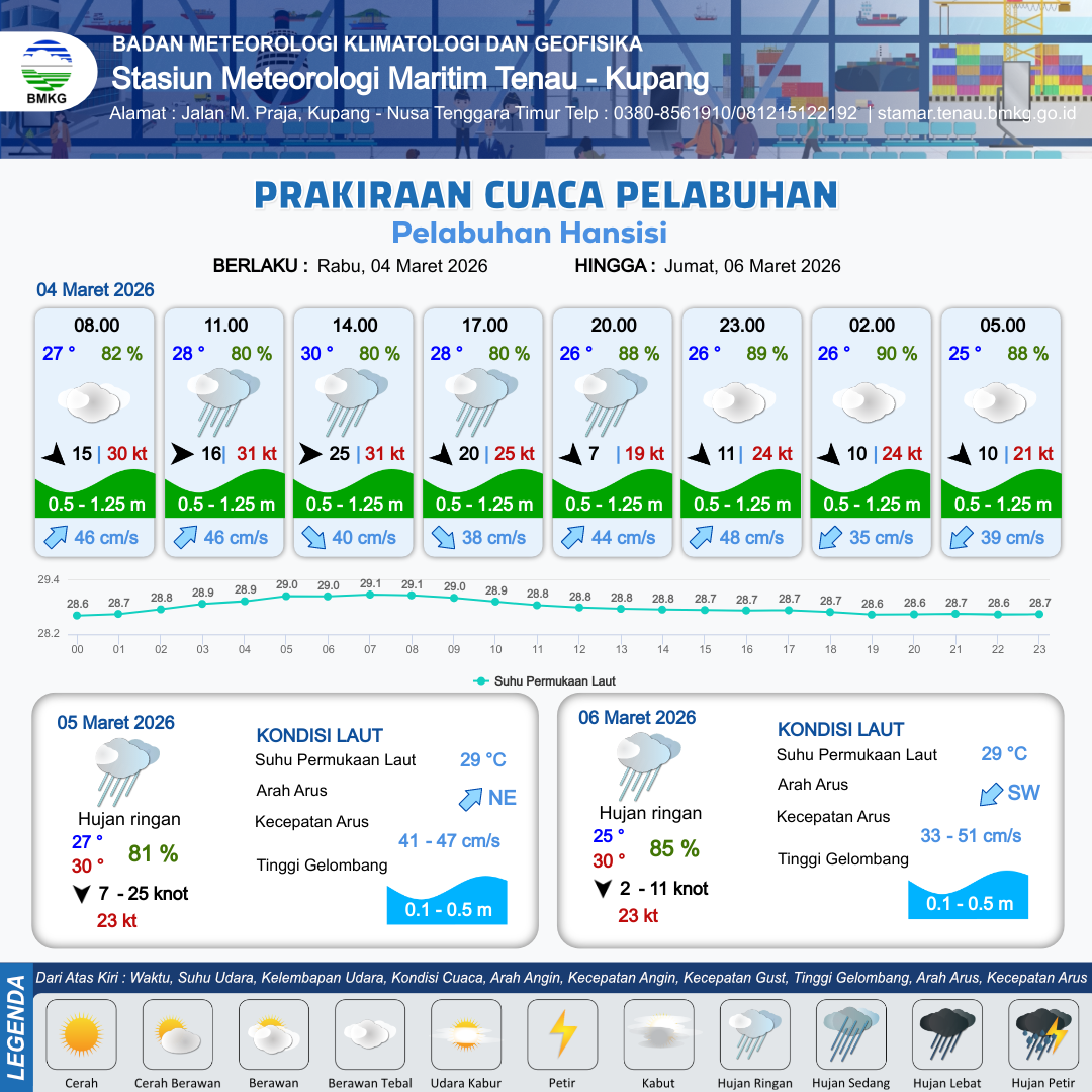 3 Mar 26, 23.00 3 jam kedepan | Berawan | Barat Laut 15 kt Gust Peningkatan kecepatan angin yang singkat dan tiba-tiba : 26 kt | | | 8 km | 27 °C | 80 % | -1.09 m |