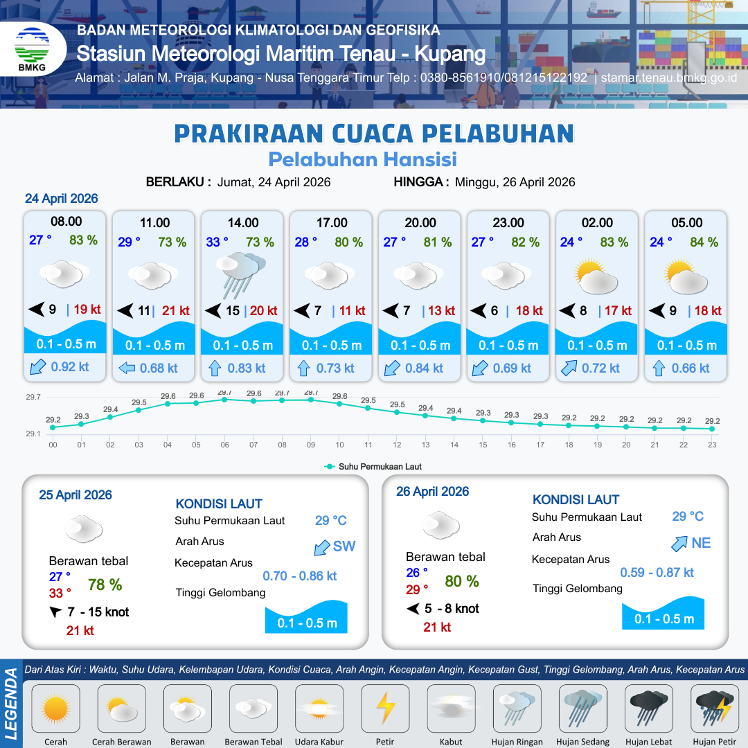 24 Apr 26, 12.00 4 jam kedepan | Timur 7 kt Gust Peningkatan kecepatan angin yang singkat dan tiba-tiba : 13 kt | 0.5 m Rendah | Barat Daya 0.8 Knot | 8 km | 27 °C | 81 % | -0.49 m | |