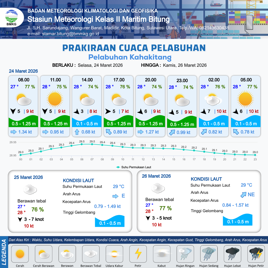 24 Mar 26, 23.00 23 jam kedepan | Barat Laut 7 kt Gust Peningkatan kecepatan angin yang singkat dan tiba-tiba : 9 kt | 0.5 m Rendah | Timur Laut 1.0 Knot | 10 km | 28 °C | 76 % | +0.29 m |