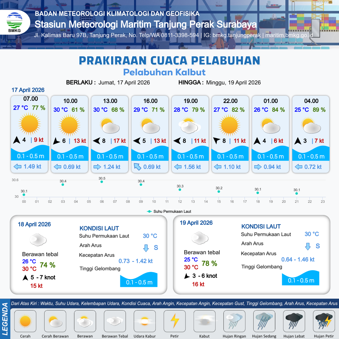 16 Apr 26, 06.00 14 jam yang lalu | Cerah Berawan | Timur 9 kt Gust Peningkatan kecepatan angin yang singkat dan tiba-tiba : 17 kt | | | 10 km | 30 °C | 68 % | +0.59 m |