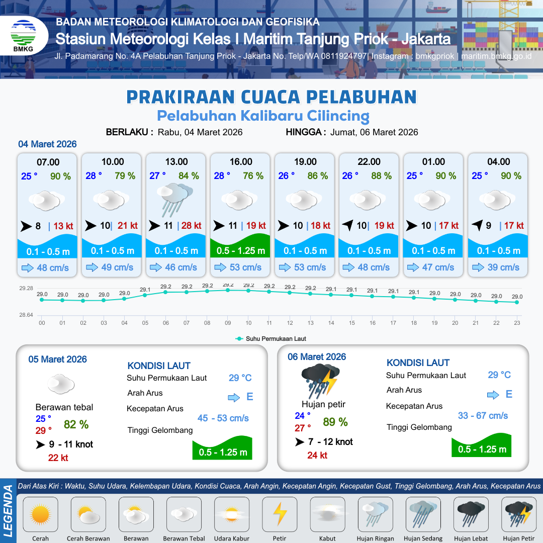 3 Mar 26, 06.00 14 jam yang lalu | Berawan Tebal | Barat 14 kt Gust Peningkatan kecepatan angin yang singkat dan tiba-tiba : 26 kt | | | 10 km | 29 °C | 72 % | +0.27 m |