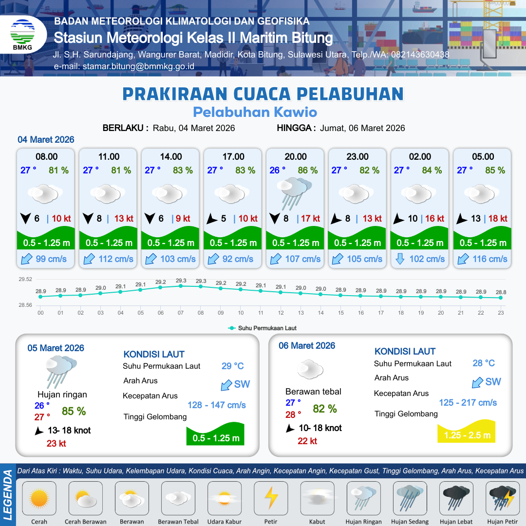 3 Mar 26, 05.00 15 jam yang lalu | Berawan Tebal | Barat Daya 2 kt Gust Peningkatan kecepatan angin yang singkat dan tiba-tiba : 7 kt | | | 9 km | 28 °C | 79 % | -0.53 m |
