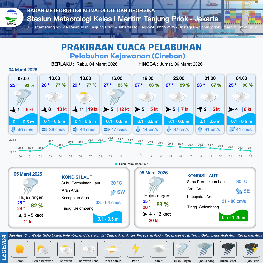 3 Mar 26, 06.00 14 jam yang lalu | Hujan Ringan | Barat Laut 17 kt Gust Peningkatan kecepatan angin yang singkat dan tiba-tiba : 24 kt | | | 8 km | 29 °C | 78 % | +0.00 m |