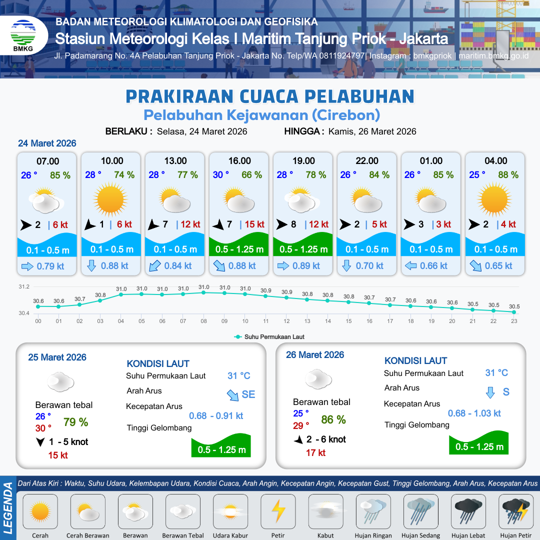 24 Mar 26, 17.00 17 jam kedepan | Barat 3 kt Gust Peningkatan kecepatan angin yang singkat dan tiba-tiba : 5 kt | 0.3 m Tenang | Barat Daya 0.7 Knot | 8 km | 26 °C | 87 % | +0.15 m | |