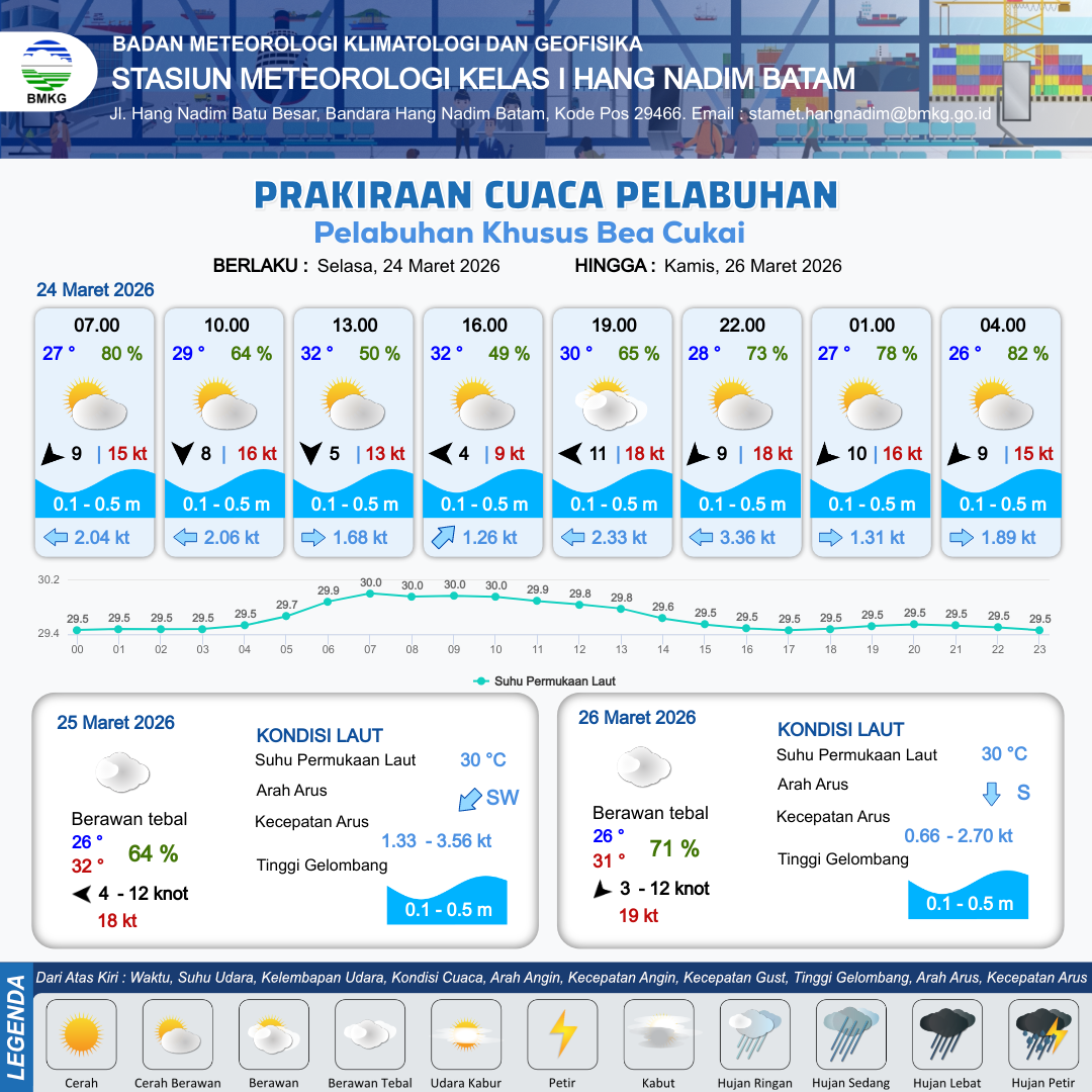 24 Mar 26, 04.00 4 jam kedepan | Utara 8 kt Gust Peningkatan kecepatan angin yang singkat dan tiba-tiba : 15 kt | 0.1 m Tenang | Barat Daya 1.0 Knot | 10 km | 30 °C | 58 % | -0.14 m | |
