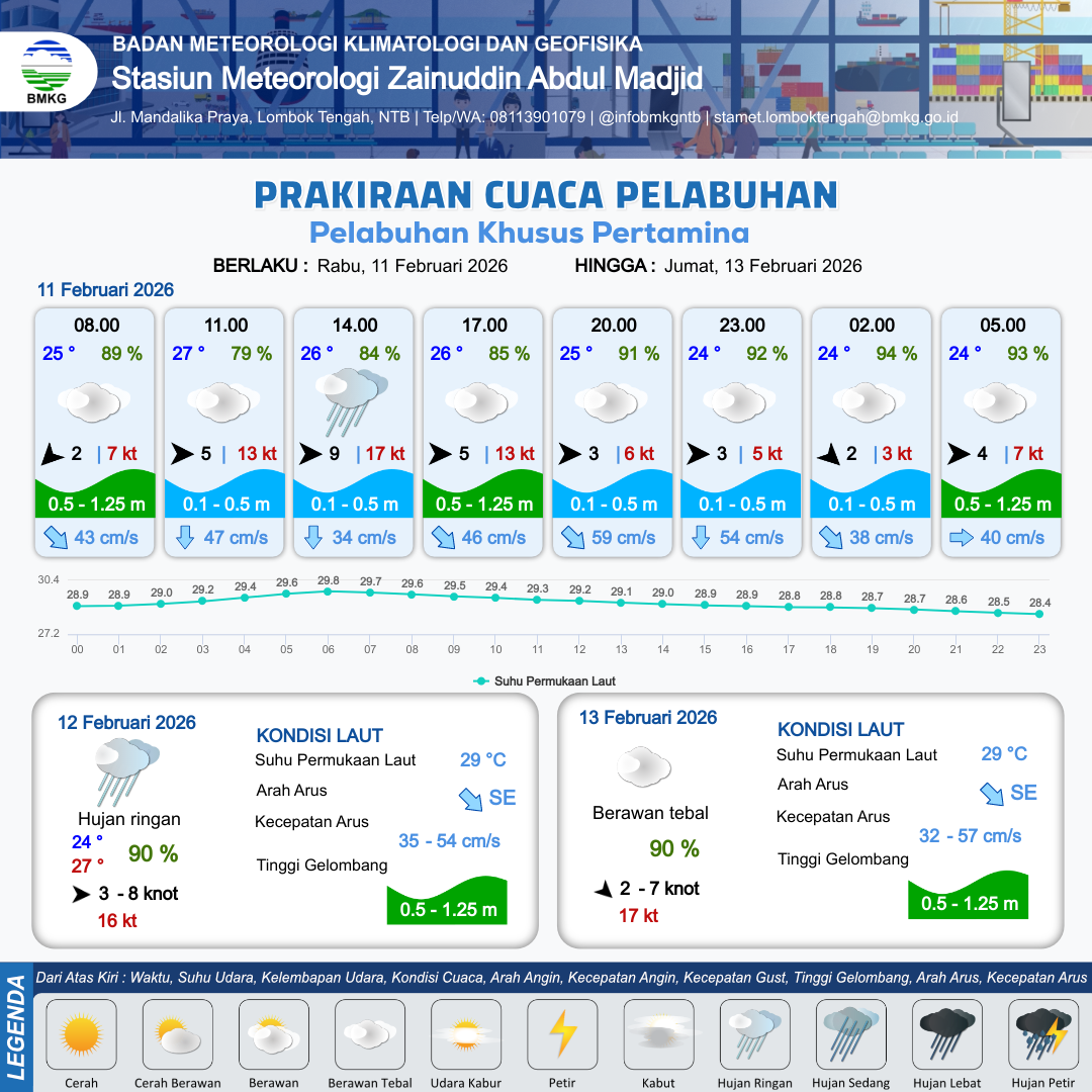 11 Feb 26, 23.00 7 jam kedepan | Barat 3 kt Gust Peningkatan kecepatan angin yang singkat dan tiba-tiba : 5 kt | 0.7 m Rendah | Tenggara 36.0 cm/s | 8 km | 25 °C | 93 % | -0.24 m |