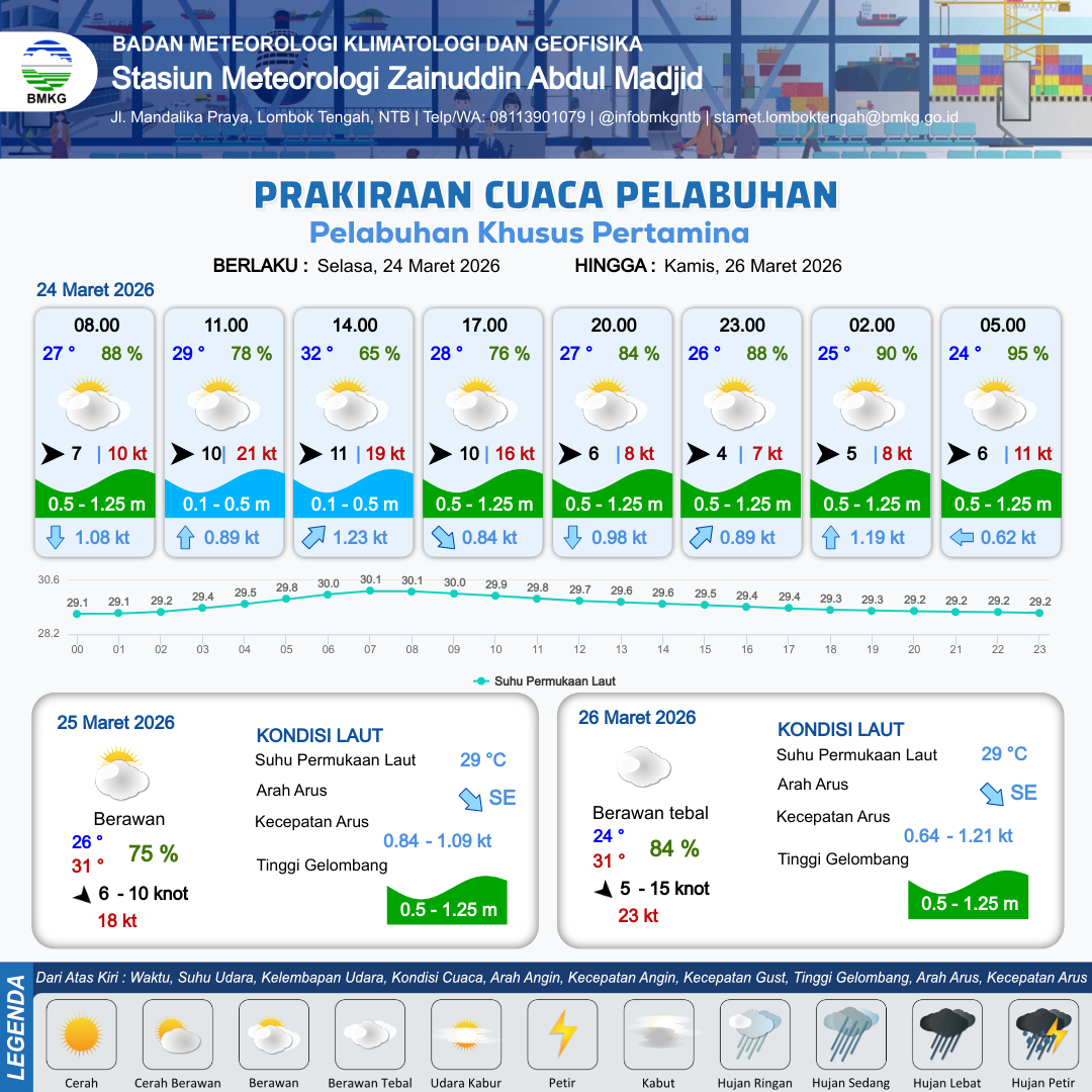 24 Mar 26, 06.00 6 jam kedepan | Barat 11 kt Gust Peningkatan kecepatan angin yang singkat dan tiba-tiba : 19 kt | 0.5 m Rendah | Timur Laut 1.2 Knot | 7 km | 32 °C | 65 % | +0.52 m | |