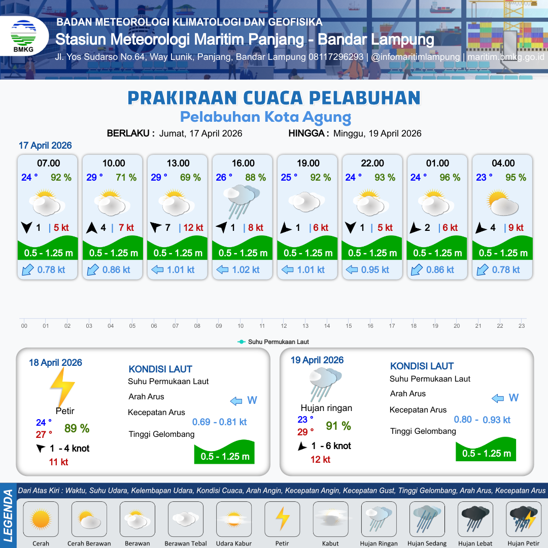 16 Apr 26, 22.00 2 jam kedepan | Berawan | Utara 2 kt Gust Peningkatan kecepatan angin yang singkat dan tiba-tiba : 6 kt | | | 10 km | 23 °C | 92 % | +0.63 m |