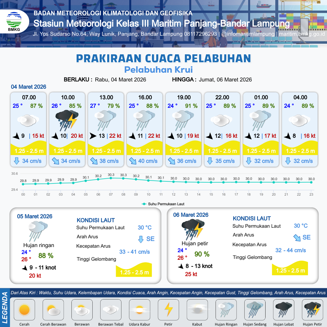 3 Mar 26, 23.00 3 jam kedepan | Berawan Tebal | Barat 7 kt Gust Peningkatan kecepatan angin yang singkat dan tiba-tiba : 20 kt | | | 10 km | 24 °C | 89 % | +0.18 m |