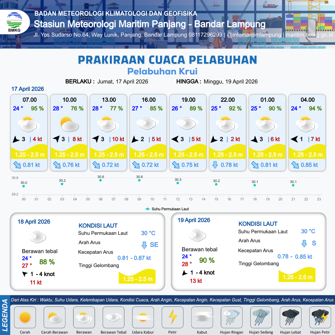16 Apr 26, 23.00 4 jam kedepan | Cerah Berawan | Timur Laut 4 kt Gust Peningkatan kecepatan angin yang singkat dan tiba-tiba : 4 kt | | | 10 km | 23 °C | 94 % | +0.63 m |