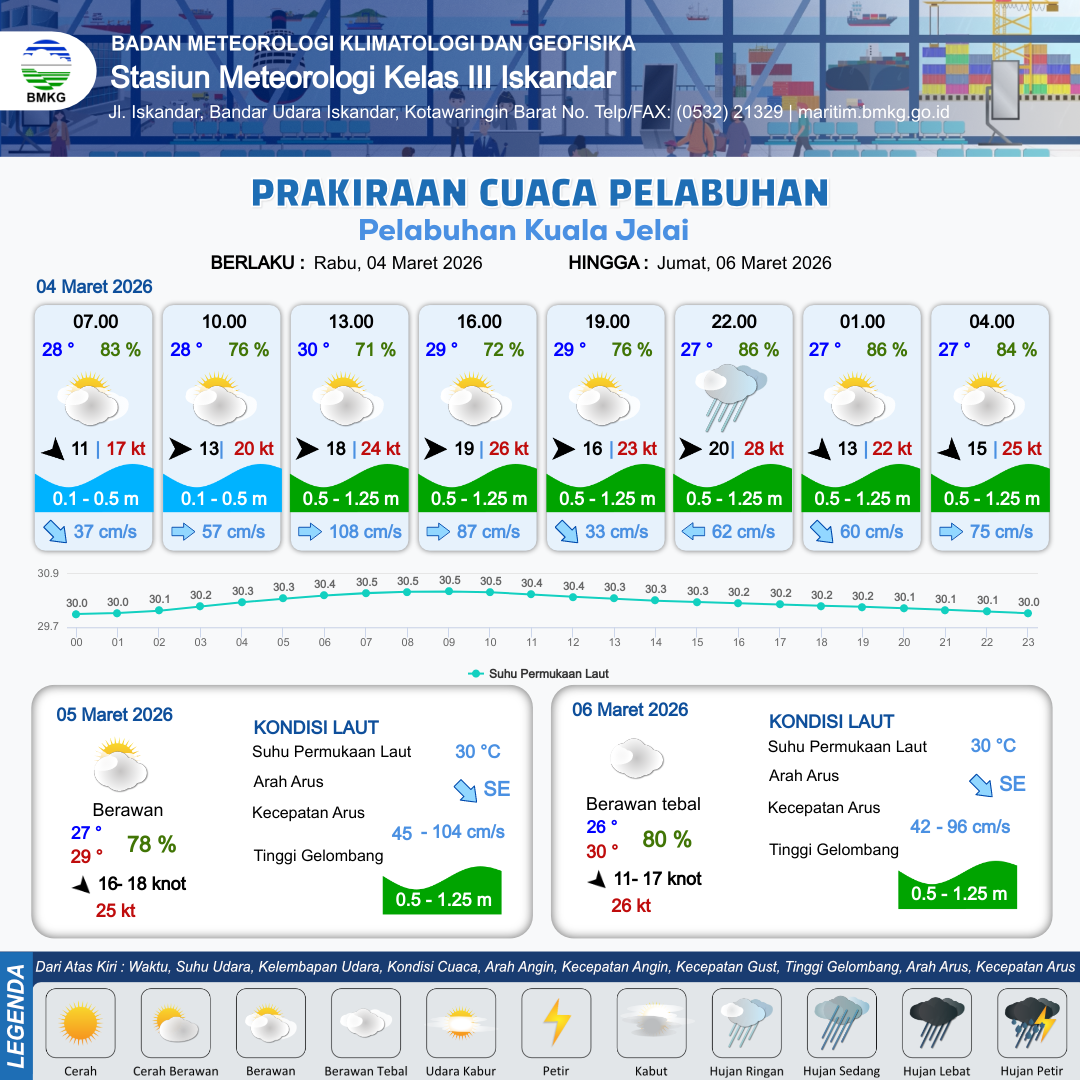 3 Mar 26, 11.00 9 jam yang lalu | Berawan | Barat Laut 13 kt Gust Peningkatan kecepatan angin yang singkat dan tiba-tiba : 22 kt | | | 9 km | 29 °C | 75 % | +0.47 m |