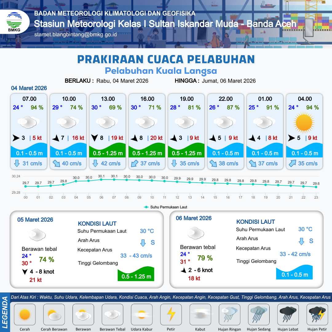 3 Mar 26, 05.00 15 jam yang lalu | Berawan Tebal | Utara 6 kt Gust Peningkatan kecepatan angin yang singkat dan tiba-tiba : 12 kt | | | 10 km | 30 °C | 71 % | +0.56 m |