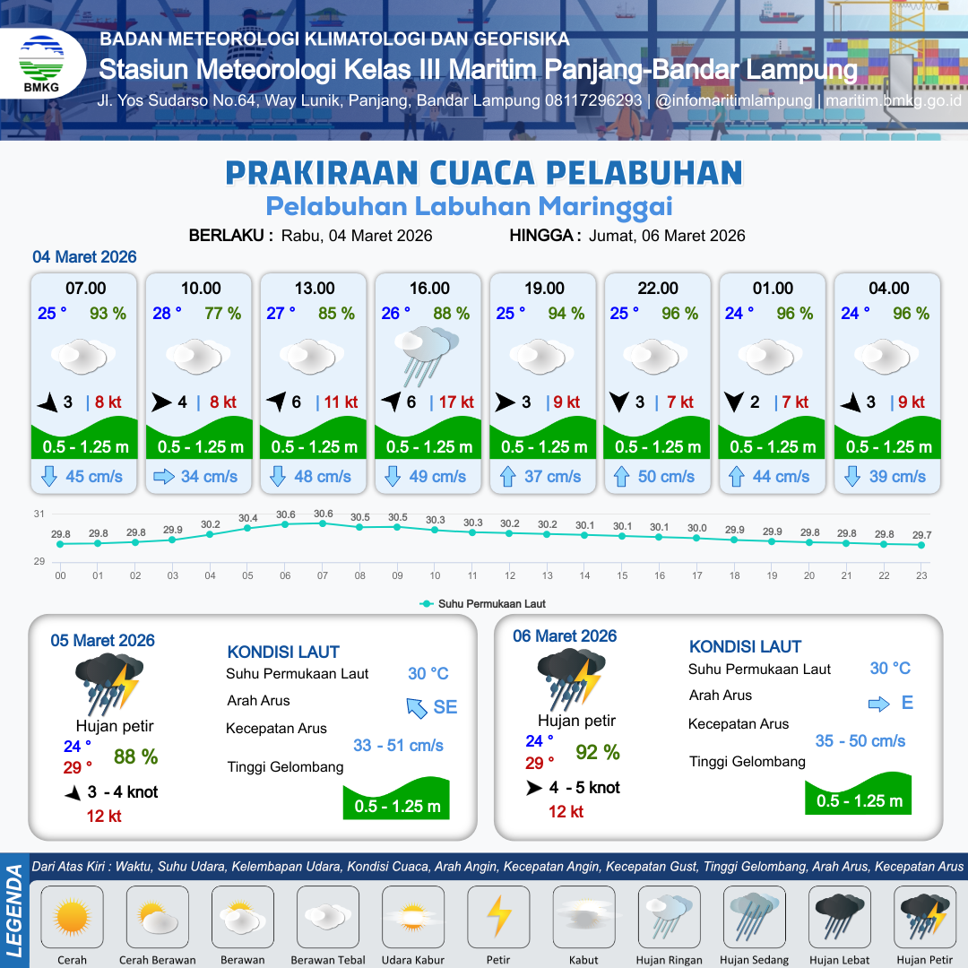 3 Mar 26, 05.00 15 jam yang lalu | Berawan Tebal | Barat 3 kt Gust Peningkatan kecepatan angin yang singkat dan tiba-tiba : 5 kt | | | 10 km | 30 °C | 72 % | +0.18 m |