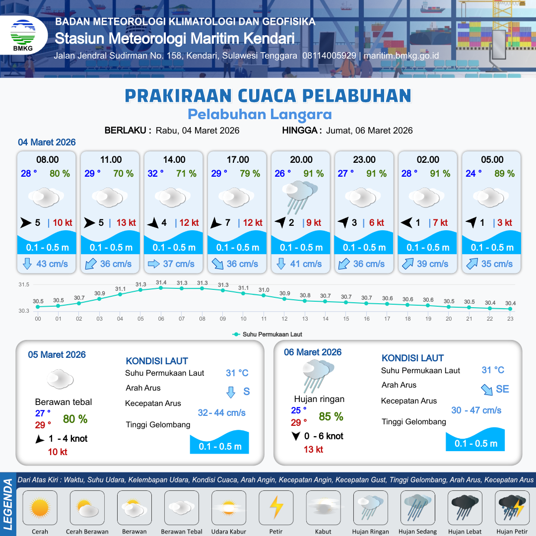 3 Mar 26, 05.00 15 jam yang lalu | Berawan | Barat 6 kt Gust Peningkatan kecepatan angin yang singkat dan tiba-tiba : 10 kt | | | 10 km | 30 °C | 72 % | +0.80 m |