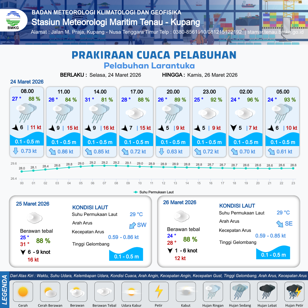 24 Mar 26, 14.00 14 jam kedepan | Barat Laut 5 kt Gust Peningkatan kecepatan angin yang singkat dan tiba-tiba : 9 kt | 0.1 m Tenang | Selatan 0.7 Knot | 8 km | 25 °C | 95 % | -0.83 m | |