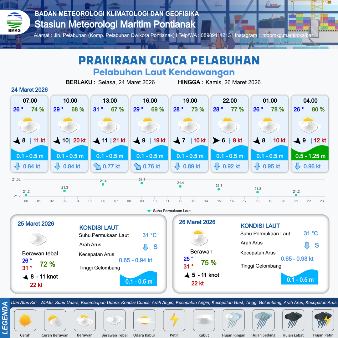 24 Mar 26, 14.00 14 jam kedepan | Barat 6 kt Gust Peningkatan kecepatan angin yang singkat dan tiba-tiba : 10 kt | 0.5 m Rendah | Selatan 0.9 Knot | 10 km | 28 °C | 76 % | -0.09 m | |