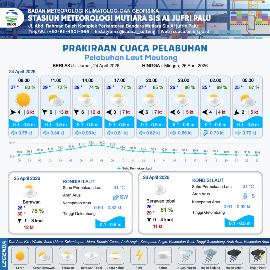 24 Apr 26, 12.00 4 jam kedepan | Timur 6 kt Gust Peningkatan kecepatan angin yang singkat dan tiba-tiba : 7 kt | 0.3 m Tenang | Selatan 0.6 Knot | 10 km | 27 °C | 85 % | -0.03 m | |