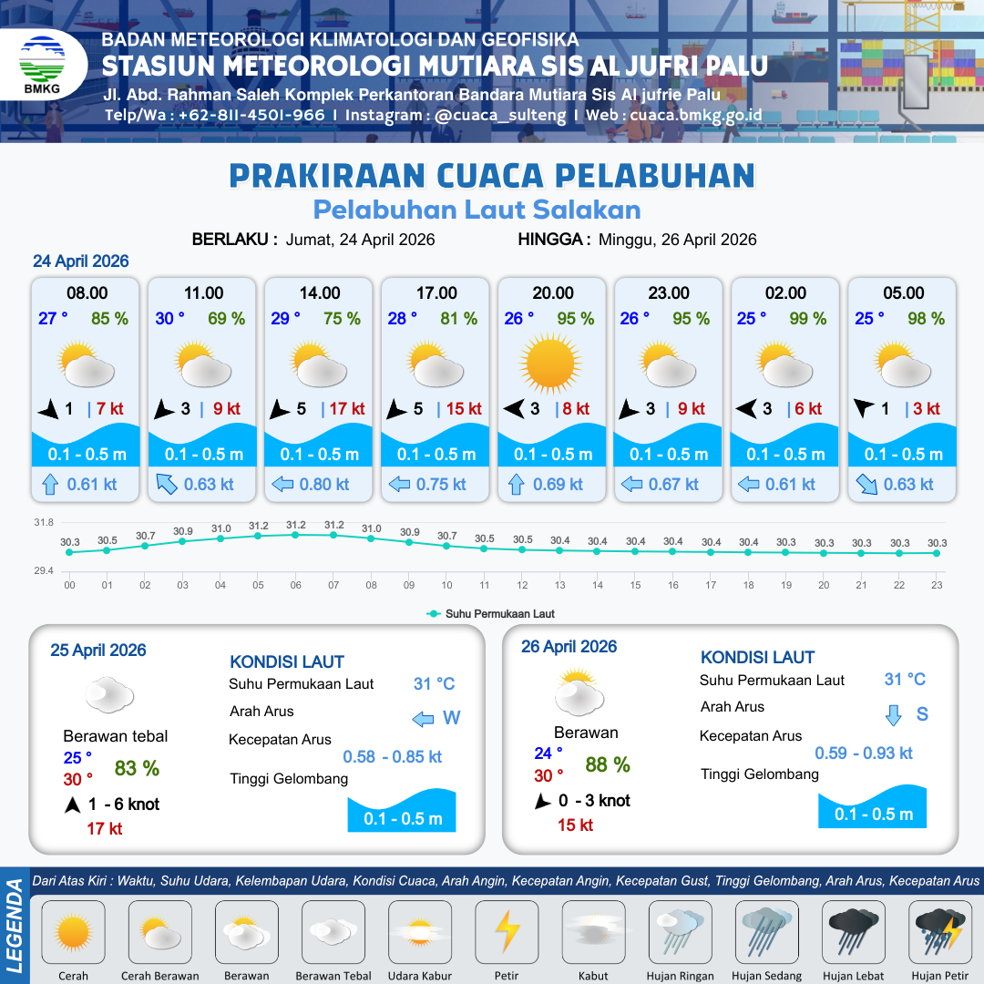 24 Apr 26, 20.00 12 jam kedepan | Tenggara 1 kt Gust Peningkatan kecepatan angin yang singkat dan tiba-tiba : 6 kt | 0.1 m Tenang | Tenggara 0.6 Knot | 7 km | 25 °C | 99 % | -0.12 m | |