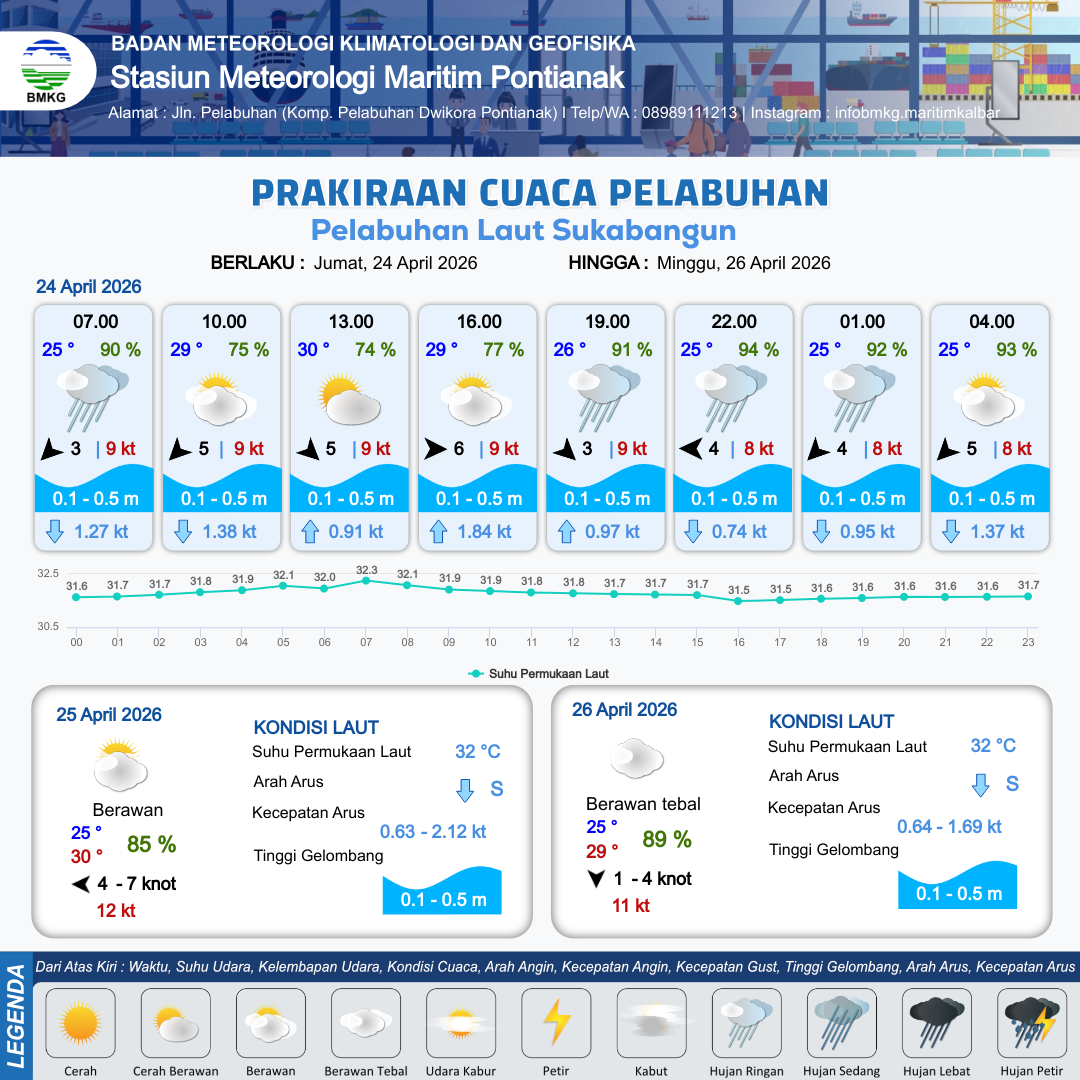 24 Apr 26, 23.00 15 jam kedepan | Timur 7 kt Gust Peningkatan kecepatan angin yang singkat dan tiba-tiba : 12 kt | 0.2 m Tenang | Selatan 1.1 Knot | 8 km | 25 °C | 95 % | +0.93 m |